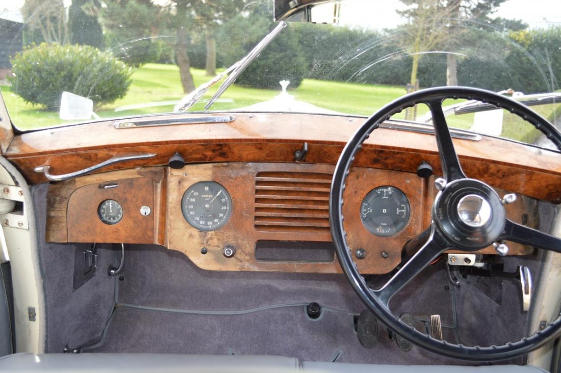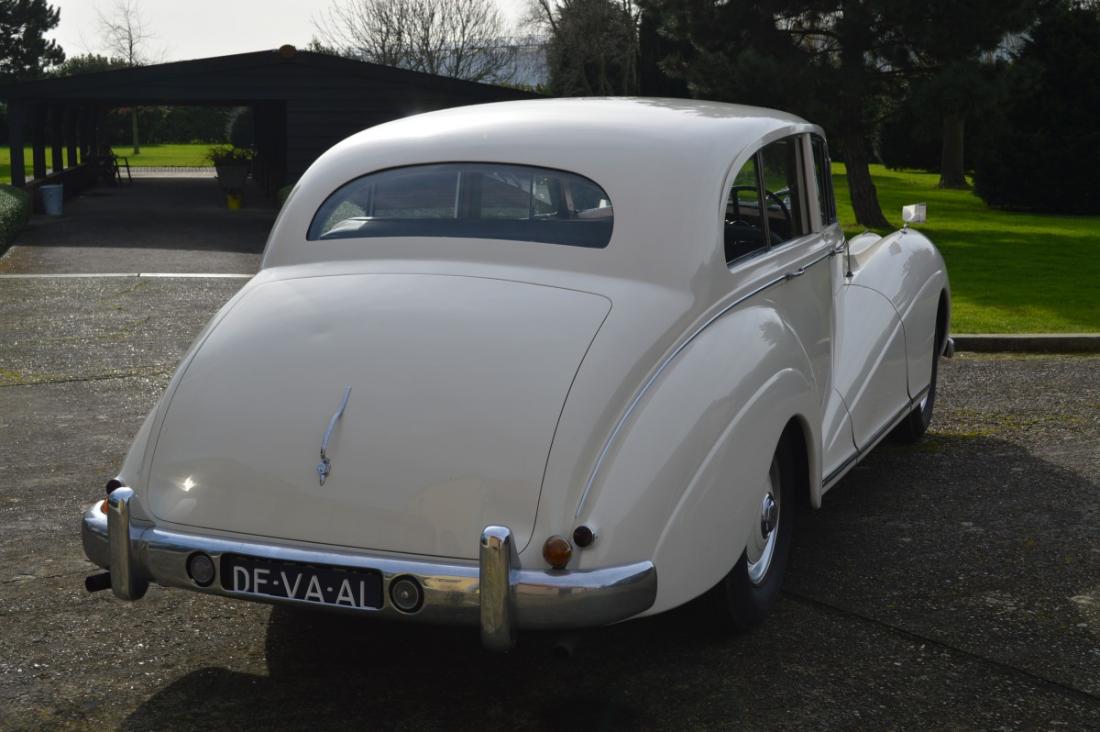 This elegant Bentley Mk VI was provided with a coach by James Young. The production of this model stuck to 35 examples, making it a rare opportunity. This design C12, body number 1977, has the unique characteristic of a 4d6l saloon body. This abbreviation means 4-door, 6-light, refering to 4 passenger doors and 6 side windows. It points out that side windows have been made behind the doors, usually resulting in a very spacious car. This is the only 4d6l design by James Young for a Mk VI.